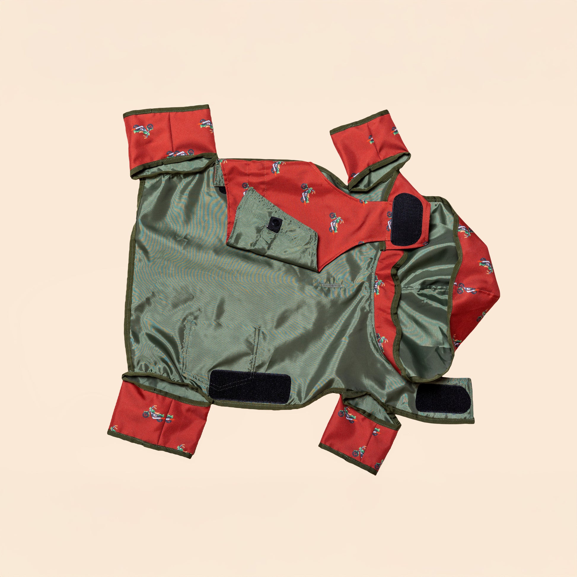 The WILD CHERRY collection’s standout piece, the Harley Jumpsuit, fuses the colors of the rainforest with the bold spirit of biker culture — all in one effortlessly stylish jacket. The deep cherry-red base is elevated by green trims and a matching hood, while the playful motorcycle-inspired patterns radiate raw, untamed energy. A practical flap pocket detail on the back enhances its laid-back yet distinctive design.