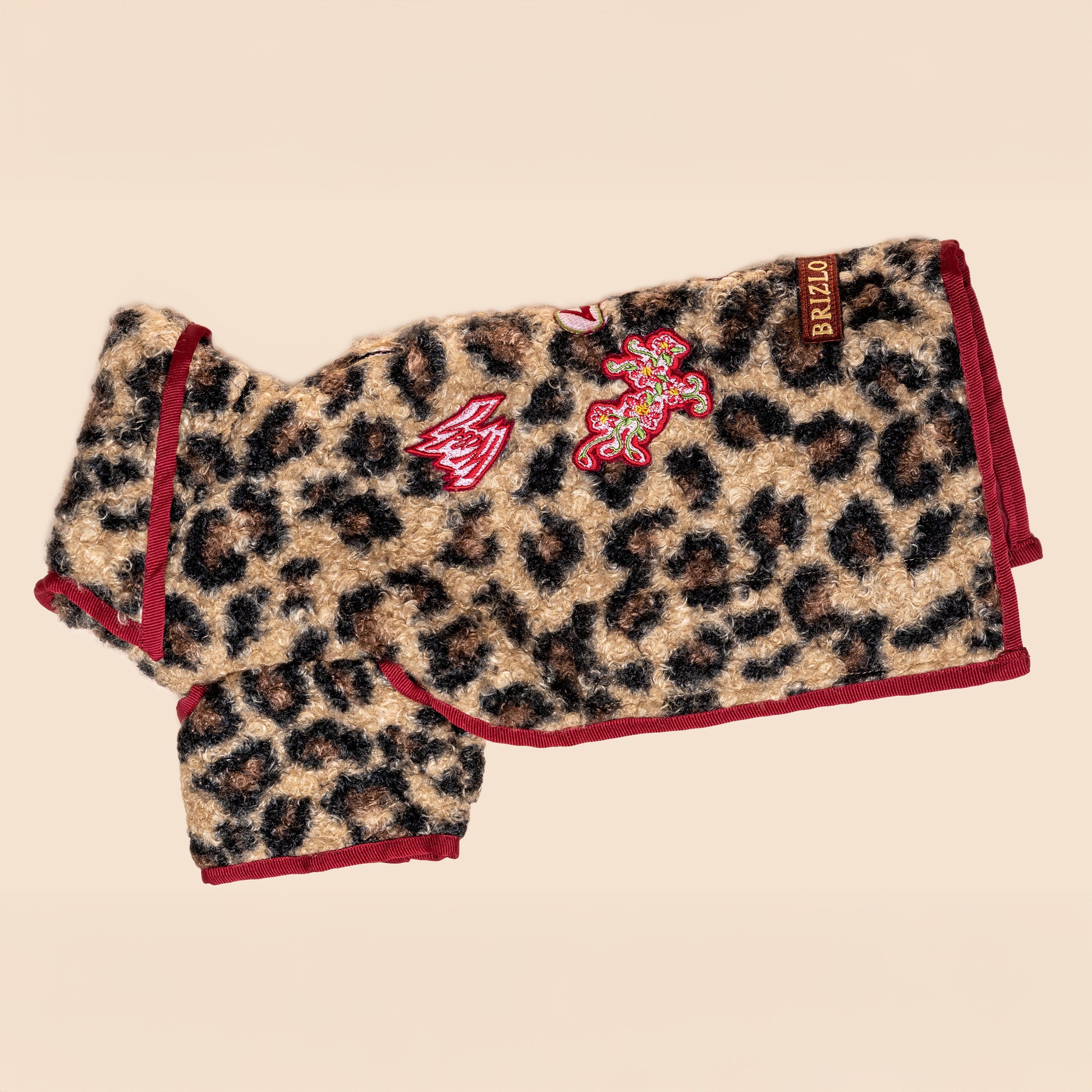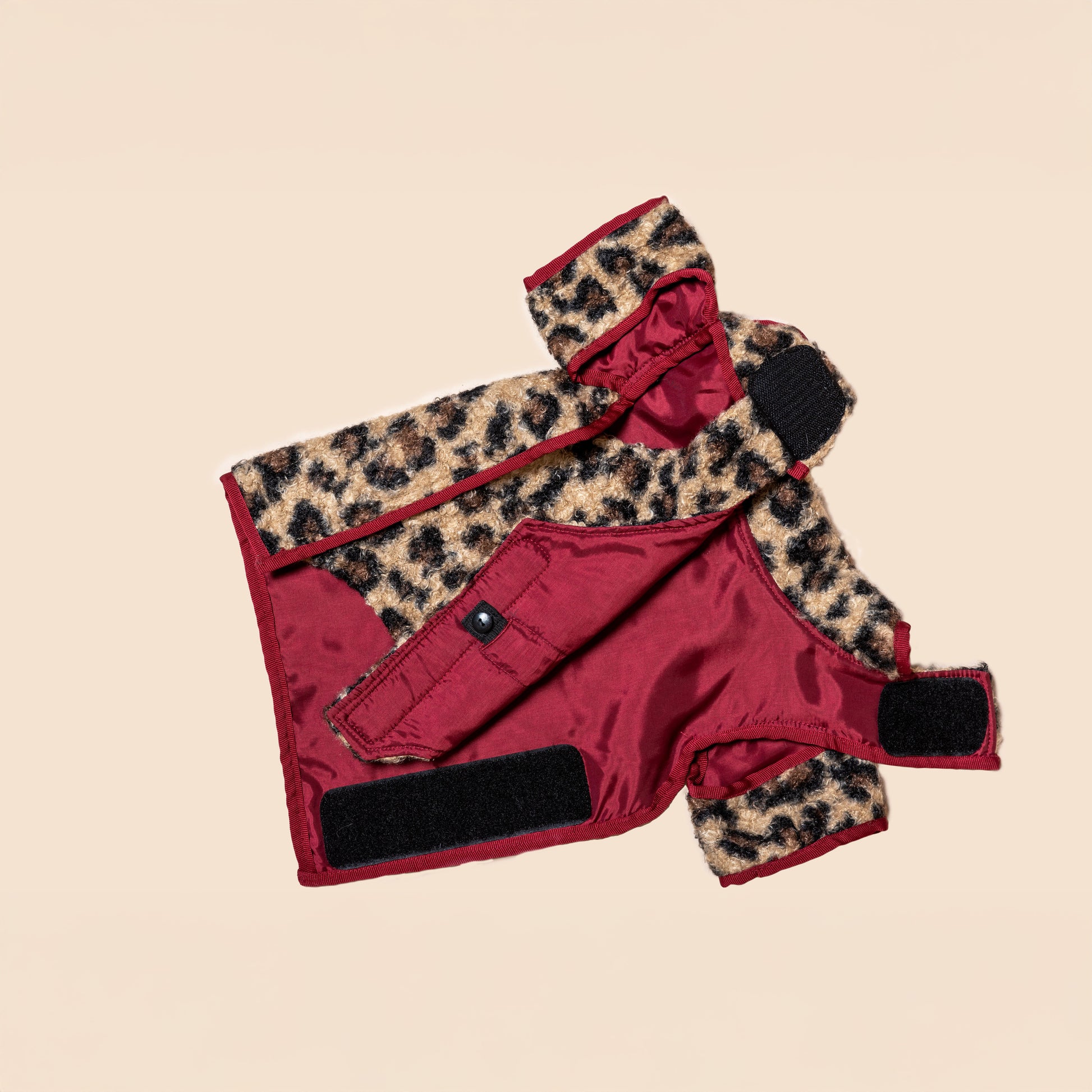 The Wild Teddy Jacket is one of the most distinctive pieces in the Wild Cherry collection — designed for bold, confident pups who love to stand out from the crowd. The leopard print gives it a daring yet effortlessly chic look that’s sure to turn heads on every walk. Deep burgundy trims and delicate embroidered details add character and charm, blending elegance with a touch of playfulness.